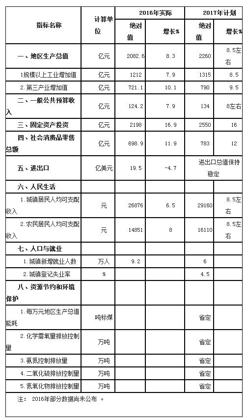 2017年经济社会发展的主要预期目标是:生产总值增长8.5%左右,规模以上工业增加值增长8.5%,第三产业增加值增长9.5%,一般公共预算收入增长8%左右,社会消费品零售总额增长12%,全社会固定资产投资增长16%,进出口总值保持稳定,居民收入与经济增长基本同步,城镇新增就业6万人以上,节能减排、环境保护等约束性指标完成省定任务,发展质量和效益明显提高,结构性改革取得实质性进展。