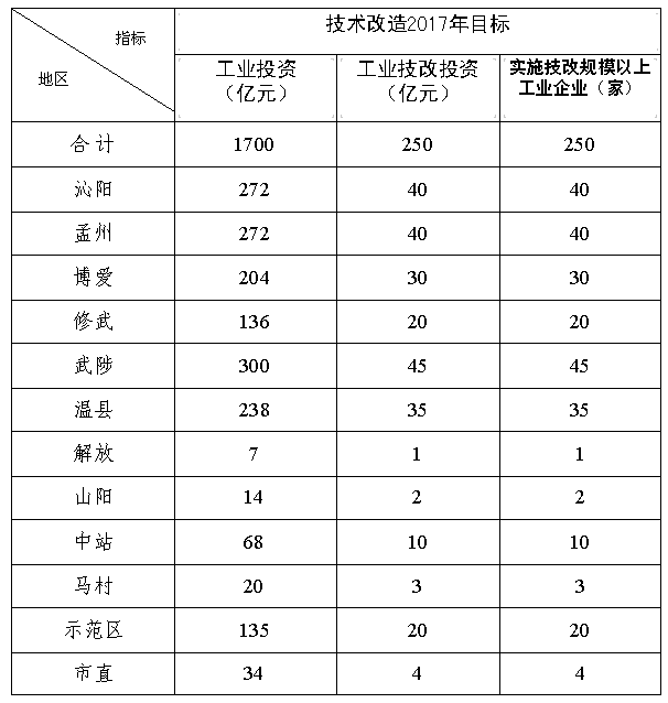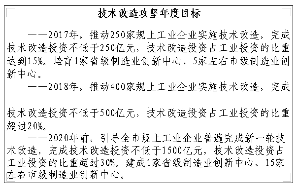 时间节点:每年技术改造投资增长高于工业投资增长10个百分点以上,2017年全市250家规模以上工业企业完成新一轮技术改造,到2020年完成全市规模以上工业企业新一轮技术改造。