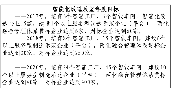 深化制造业与互联网融合发展,以制造业转型升级和提质增效为主线,以推进智能化改造为主攻方向,着力发展智能装备和智能产品,突出企业主体地位,大力拓展互联网与制造业融合的深度和广度,积极培育新技术、新产品、新业态、新模式,创新政府服务模式,释放发展潜力和活力,推动产业转型升级和提质增效,推进生产过程智能化,培育新型生产方式,全面提升企业研发、生产、管理和服务的智能化水平,提升信息化环境下企业核心竞争力。到2020年,智能化改造由重点骨干企业向多领域、全行业拓展,力争两化融合发展指数居全省前列。