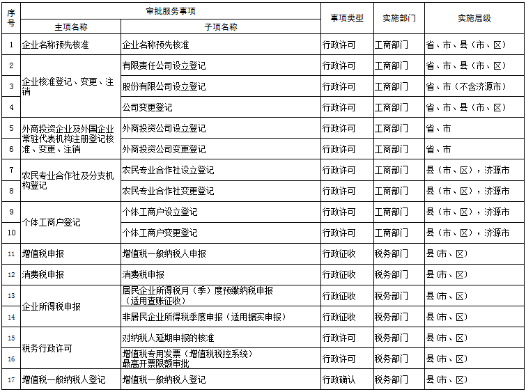 目前,《河南省“一网通办”前提下“最多跑一次”审批服务事项目录(第一批)》正式公布实施,接受企业和群众监督。首批事项目录主要涉及工商部门的有限责任公司、股份有限公司以及个体工商户设立登记、税务部门的增值税一般纳税人申报,公安部门的购房入户、畜牧部门的执业兽医资格认定、质监部门的重要工业产品生产许可证核发、安全监管部门的乙级职业卫生技术服务机构资质认可、人力资源社会保障部门的海外留学人才来豫工作就业报到证办理、卫生计生部门的涉及饮用水卫生安全的产品许可、食品药品监管部门的出具药品销售证明书等111个审批服务事项。