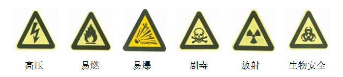 危险标识由安全色,几何图形和图形符号构成,用以表达特定的危险信息,提示人们周围环境中有相关危险因素存在。常见的危险标识包括高压、易燃、易爆、剧毒、放射、生物安全等。