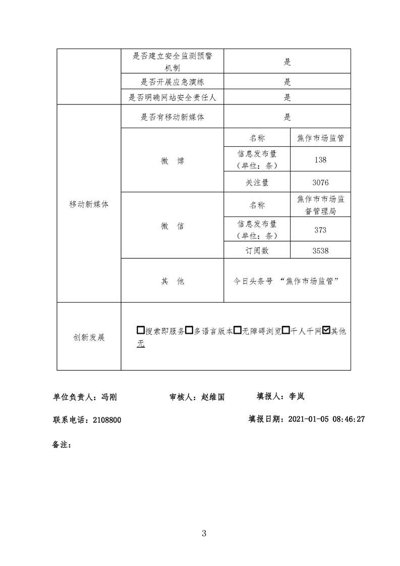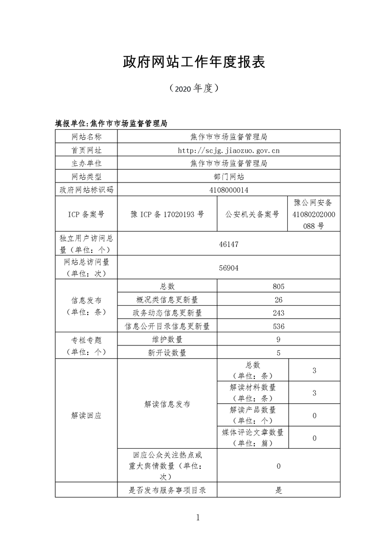 2020年焦作市市场监督管理局网站工作年度报表