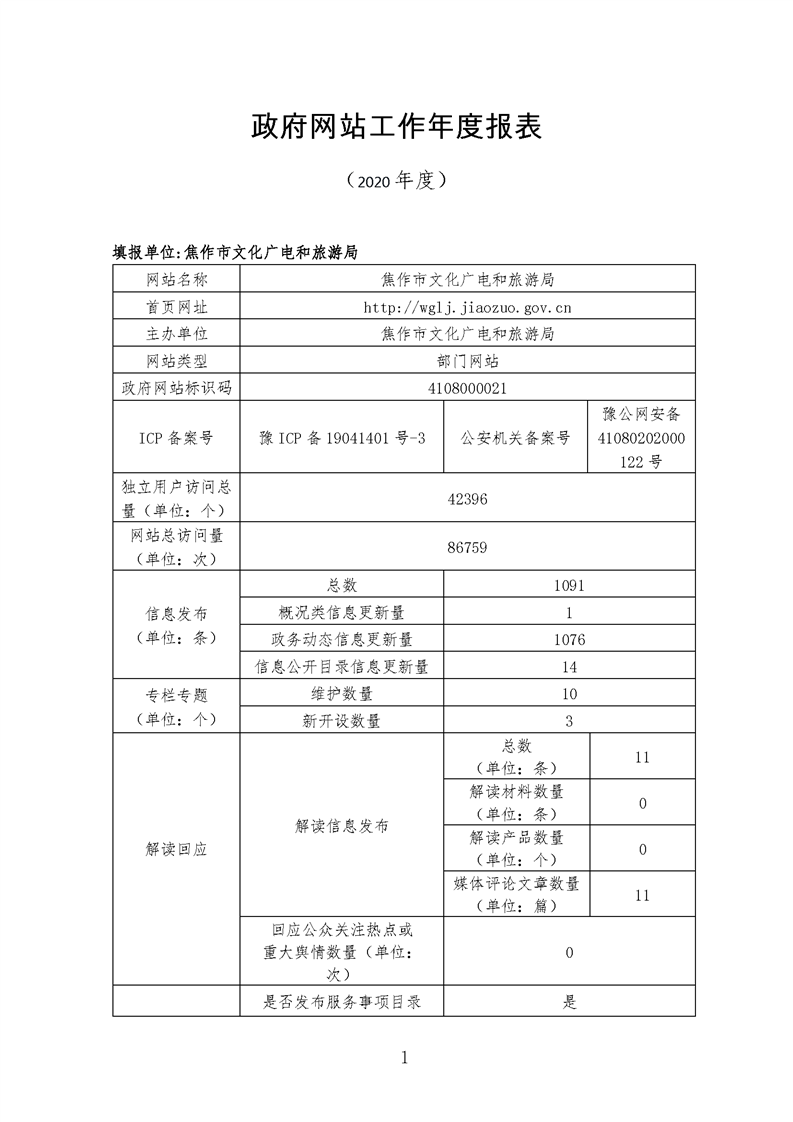 2020年焦作市文化广电和旅游局网站工作年度报表