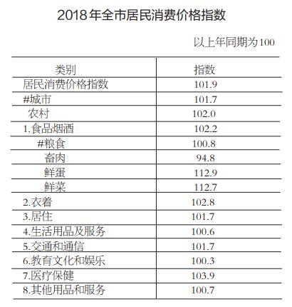 全年居民消费价格比上年上涨1.9%。其中,食品烟酒类价格上涨2.2%,衣着类价格上涨2.8%,居住类价格上涨1.7%。商品零售价格上涨2.2%,农业生产资料价格上涨3.5%。