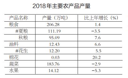 全年粮食产量206.28万吨,比上年增长1.4%;棉花产量0.03万吨,增长20.2%;油料产量12.43万吨,增长6.6%;蔬菜产量183.76万吨,下降2.9%。肉类总产量15.75万吨,下降1.3%;禽蛋产量10.9万吨,下降1.6%;牛奶产量17.76万吨,增长19.1%。