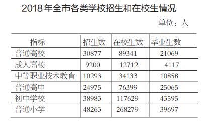 全年普通高等学校招生3.09万人,在校生8.93万人,毕业生2.11万人。普通高中招生2.50万人,在校生7.64万人,毕业生2.51万人。初中学校招生3.90万人,在校生11.76万人,毕业生4.36万人。普通小学招生4.83万人,在校生26.83万人,毕业生3.97万人。