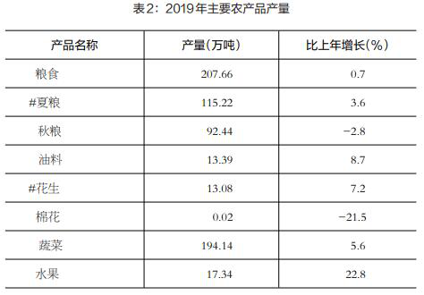 全年粮食产量207.66万吨,比上年增长0.7%;棉花产量0.02万吨,下降21.5%;油料产量13.39万吨,增长8.7%;蔬菜产量194.14万吨,增长5.6%。肉类总产量12.91万吨,下降18.0%;禽蛋产量11.84万吨,增长8.6%;牛奶产量19.08万吨,增长7.4%。
