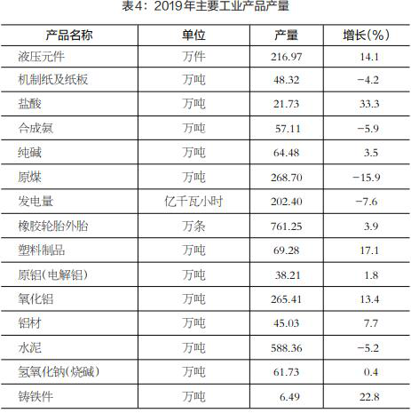 主要工业产品产量中,液压元件增长14.1%,原煤产量下降15.9%,发电量下降7.6%,橡胶轮胎外胎增长3.9%,塑料制品增长17.1%,电解铝增长1.8%,氧化铝增长13.4%,铝材增长7.7%,水泥下降5.2%,烧碱增长0.4%。