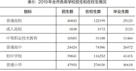 全年普通高等学校招生4.68万人,在校生12.22万人,毕业生2.51万人。普通高中招生2.44万人,在校生7.44万人,毕业生2.61万人。初中学校招生3.98万人,在校生11.63万人,毕业生4.14万人。普通小学招生4.80万人,在校生27.60万人,毕业生4.06万人。
