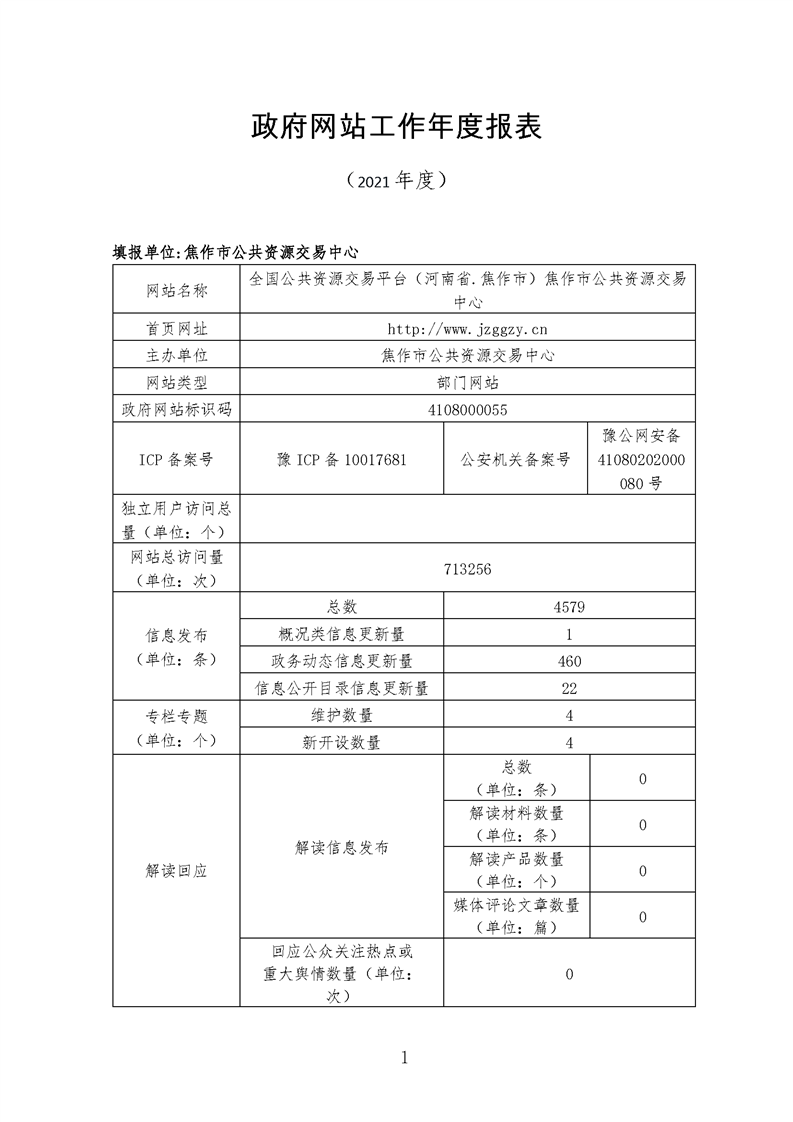 2021年焦作市公共资源交易中心网站工作年度报表