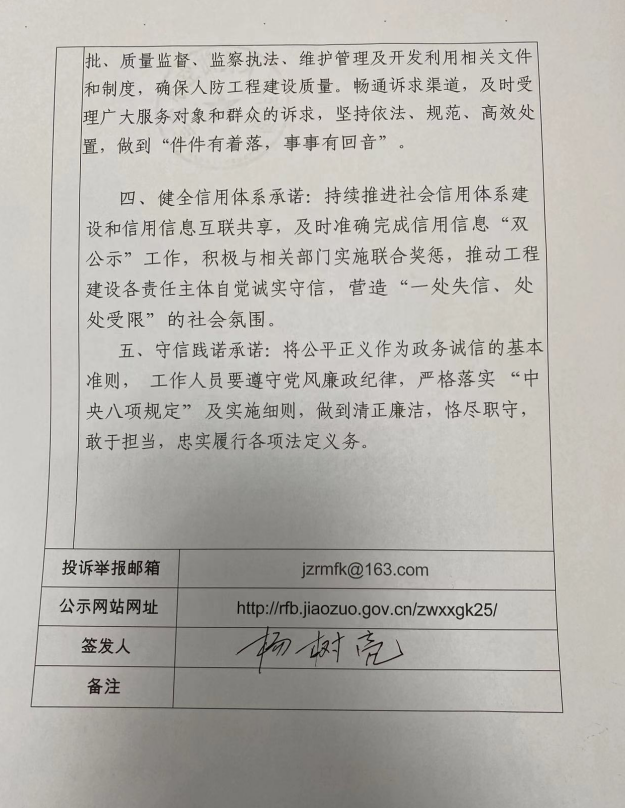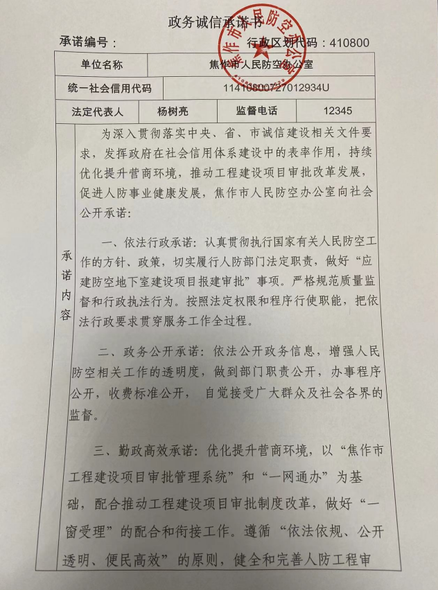 焦作市人民防空办公室政务诚信承诺书
