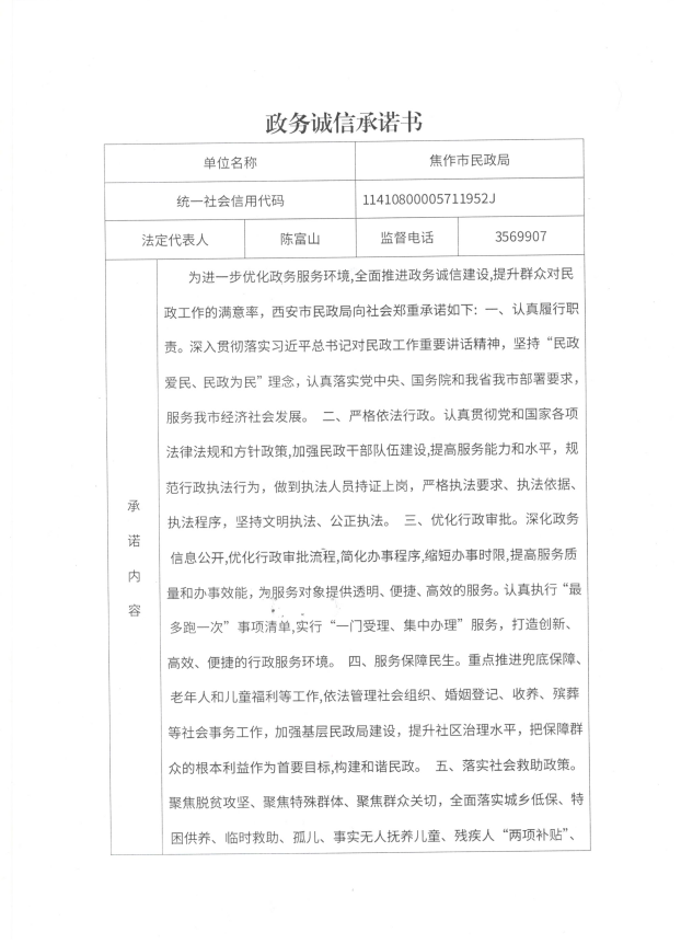 焦作市民政局政务诚信承诺书