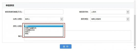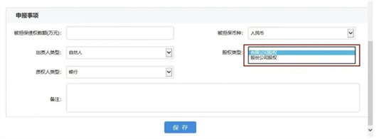 ② 申报事项中,“出质人类型”、“股权类型”和“质权人类型”需根据实际情况勾选,具体选项请参考下图红框内容。