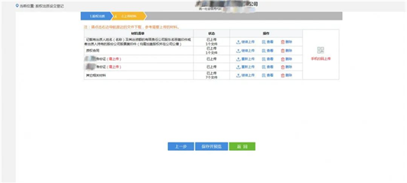 3、上传材料。根据提交材料规范,需要上传“属于出质股权数额变更的,提交质权合同修正案或者补充合同”、“属于出质人、质权人姓名(名称)更改的,提交姓名或者名称更改的证明”、“属于出质股权所在公司名称更改的,提交名称更改的证明文件”。