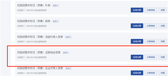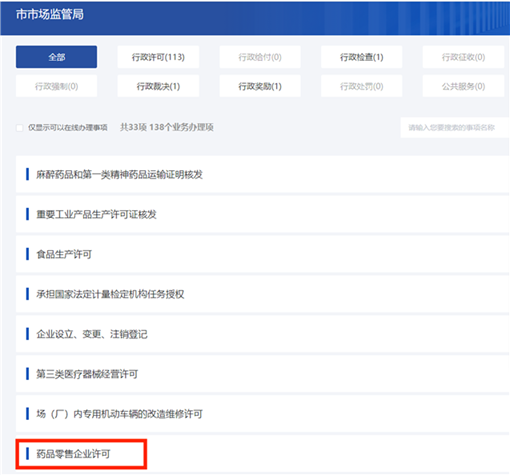 在事项列表-行政许可中找到“药品零售企业许可”点击“在线办理”进入办理页面
