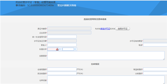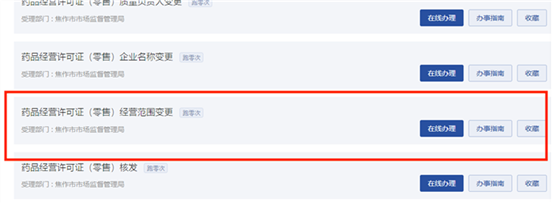 在事项列表-行政许可中找到“药品零售企业许可”点击“在线办理”进入办理页面