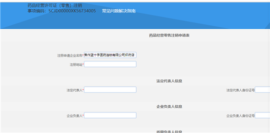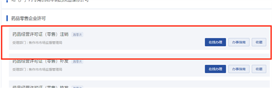 在事项列表-行政许可中找到“药品零售企业许可”点击“在线办理”进入办理页面