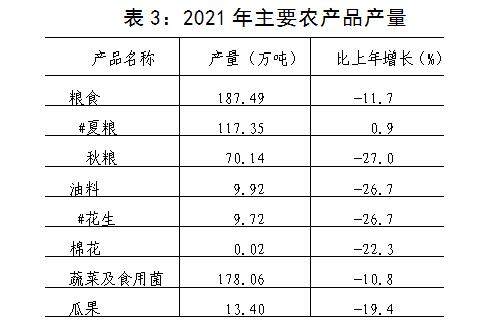 粮食产量187.49万吨,比上年减少24.89万吨,下降11.7%。其中,夏粮产量117.35万吨,增加1万吨,增长0.9%;秋粮产量70.14万吨,减少25.89万吨,下降27.0%。小麦产量117.35万吨,增加1万吨,增长0.9%;玉米产量68.27万吨,减少24.55万吨,下降26.4%。