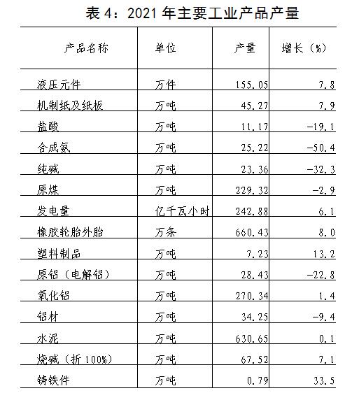 规模以上工业增加值比上年增长4.1%;产品销售率99.3%。分经济类型看,国有控股企业增加值增长-6.9%;股份制企业增长3.2%,外商和港澳台商投资企业增长15.2%。分门类看,采矿业增加值增长-7.7%,制造业增长6.2%,电力、热力、燃气及水生产和供应业增长-2.1%。全年规模以上工业中,战略性新兴产业增长8.3%,占规模以上工业27.0%;高耗能工业增长4.4%,占规模以上工业60.2%,高技术产业增长6.1%,占规模以上工业3.7%,高新技术产业增长4.3%,占规模以上工业55.4%。
