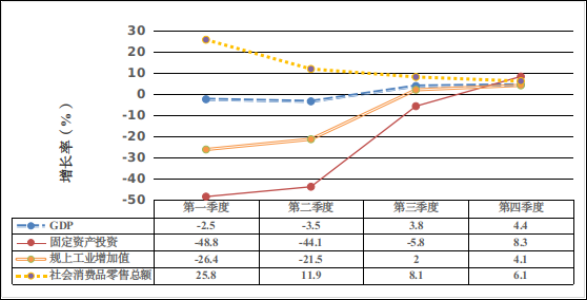 (二)经济运行平稳恢复。生产供给基本稳定。克服重大洪涝灾害影响,粮食总产187.5万吨,其中夏粮单产521.5公斤,居全省第1位。坚持工业强市战略,新增规上企业405家,扭转了2018年以来年度在库数量逐年减少的局面。绿色食品、化工新材料、轻工、生物医药等重点行业税收收入分别增长59.5%、63.7%、22.8%、11.1%。加快服务业恢复发展,商业增值税完成10.8亿元,增长44.6%。接待游客3189.3万人次,增长43%;旅游综合收入230亿元,增长31.5%。内需市场稳步改善。持续扩大有效投资,坚持重点项目建设工作机制,以三个一批“回头看”为抓手,及时有效解决困难问题,省、市重点项目分别完成年度投资计划的147.4%、149.6%。积极促进消费回暖,实施政府消费券发放、景区门票减免、汽车购买补贴等政策,中心城区新建便民消费服务中心100多家。市场主体稳健发展。强化“万人助万企”活动,全省首家建成“万人助万企”线上总调度室,为企业减税降费11.1亿元、发放贷款886亿元,解决企业反映问题1076个,获评全省“万人助万企”活动优秀省辖市。金融机构人民币存贷款余额2470.1亿元、1806.4亿元,分别增长7.1%、4.5%。各类市场主体达到25.5万户,增长8.4%;新登记4.6万户,增长11.2%。