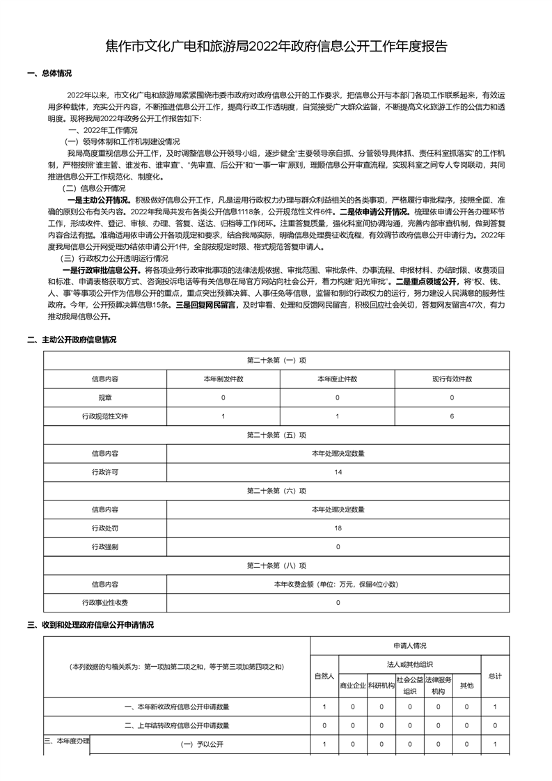 焦作市文化广电和旅游局2022年政府信息公开工作年度报告