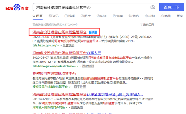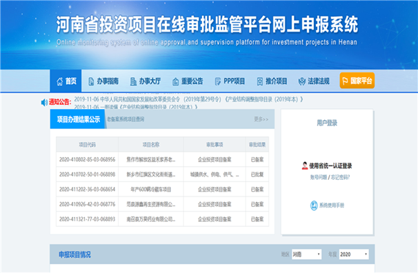 方式三:百度搜索“河南省投资项目在线审批监管平台官方网站”,打开之后点击使用省统一认证登陆输入账号密码登陆系统。