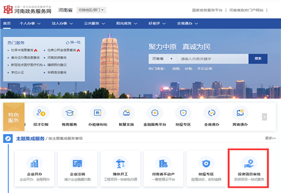 方式二:浏览器地址栏输http://www.hnzwfw.gov.cn/,打开河南政务服务网,点击投资项目审批登录之后跳转到河南省投资项目在线审批监管平台网上申报系统。