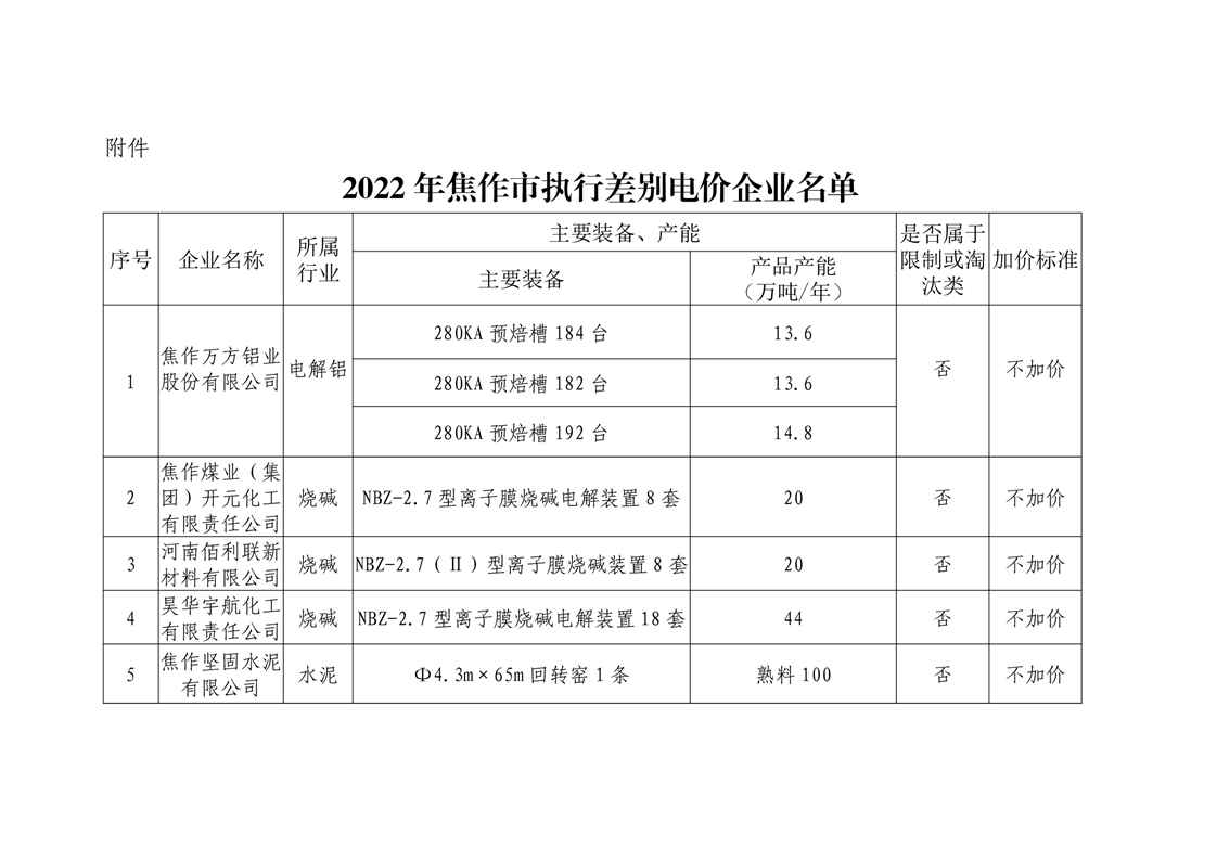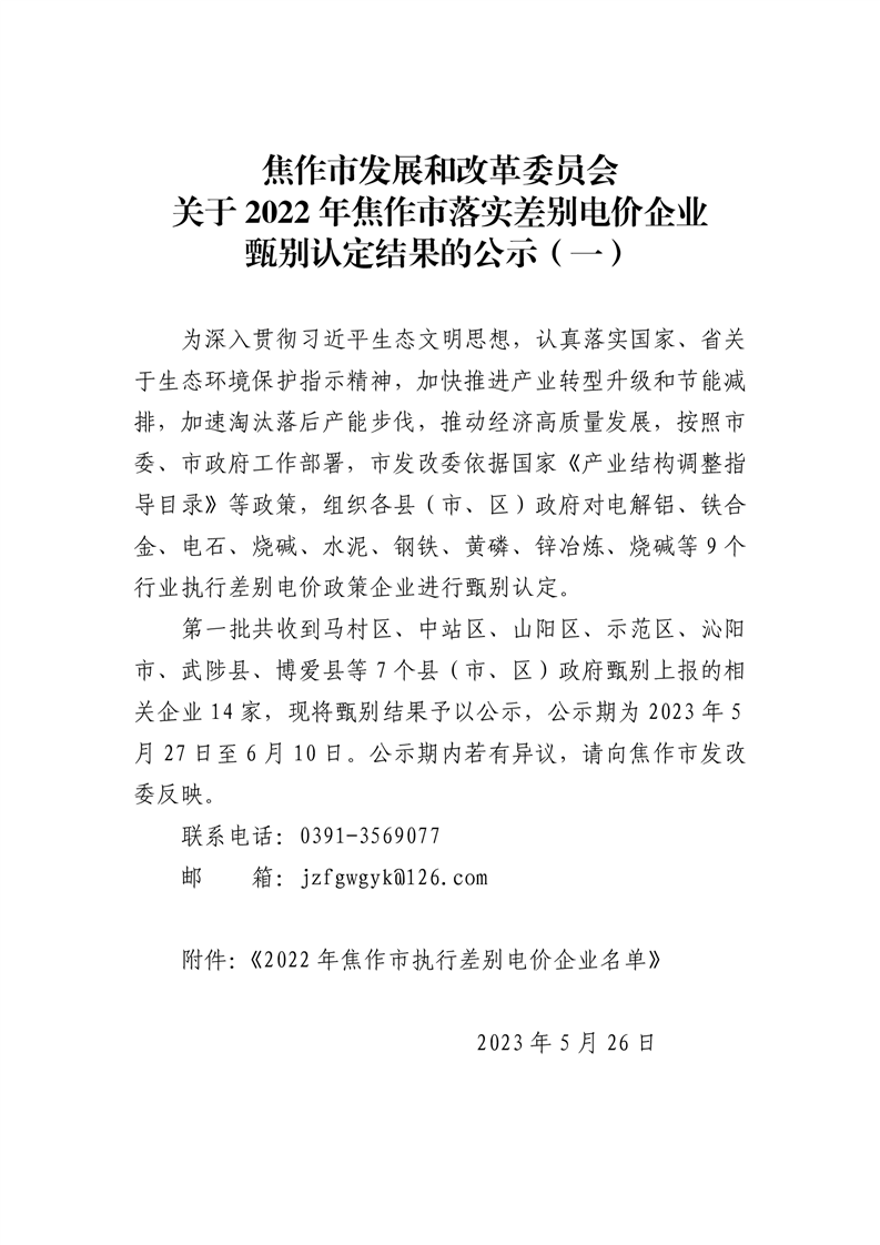 关于2022年焦作市落实差别电价企业甄别认定结果的公示(一)