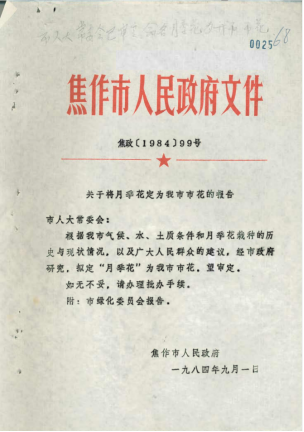 1984年9月26日,焦作市人民政府向焦作市人大常委会提交《提请焦作市人大常务委员会命名月季为“市花”的议案》。