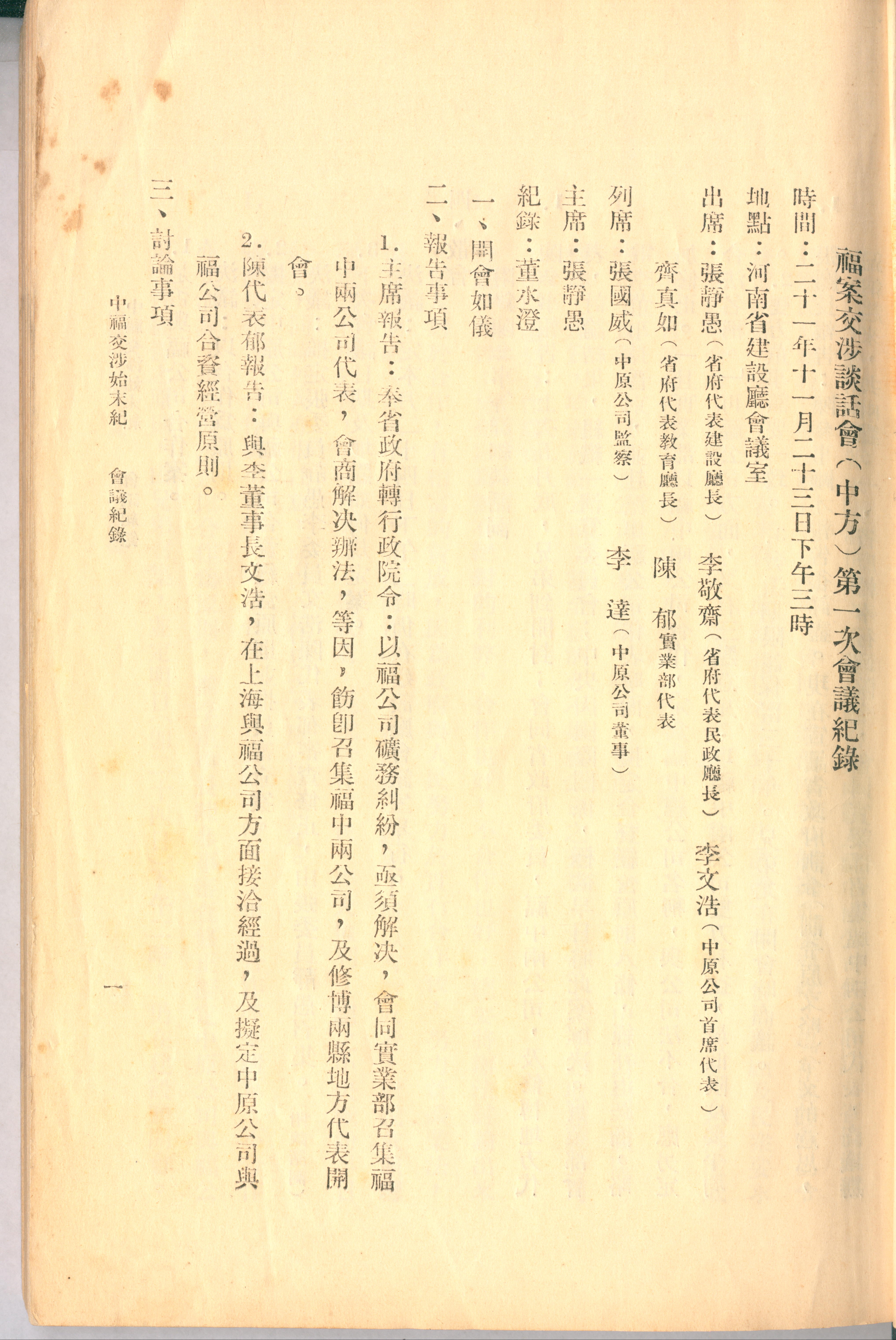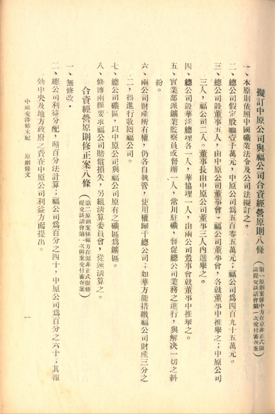 该文献于中华民国二十二年(1933年)五月由河南焦作中原股份有限公司董事会编辑,文件类编成册,开封建华印刷所印刷公诸社会。中原公司与英福公司20世纪初在焦作经营煤矿业历有年所,1925年爆发了历史上有名的福公司焦作煤矿工人大罢工,这次罢工使英福公司业务陷于停顿。时中原公司赖董事会同仁"不辞艰苦,全力赴之,组织经营、纳于时代正轨"。"未及二载,成效大著,事业扩大,利润增加"。由于福公司和中原公司均在焦作,"事业既同,距离复近,分立竞争,殊非所宜"。鉴于政治和经济等方面的原因,国民政府认为两公司有合作的必要。中原公司"遵奉总理利用外资之遗训,秉承政府之意旨,审慎研究,几经讨论",与英福公司成立合作原则及合资经营煤矿业合同。