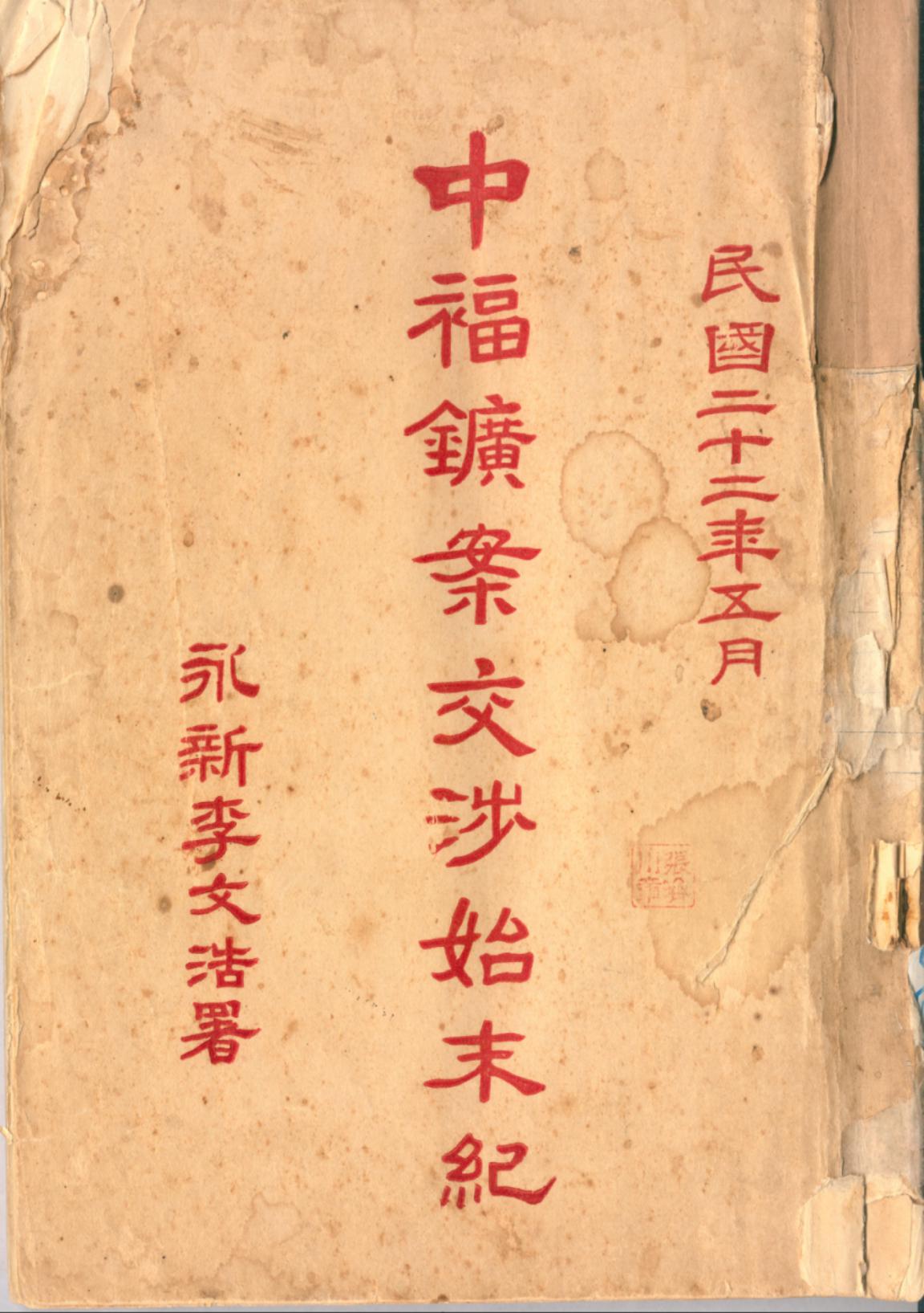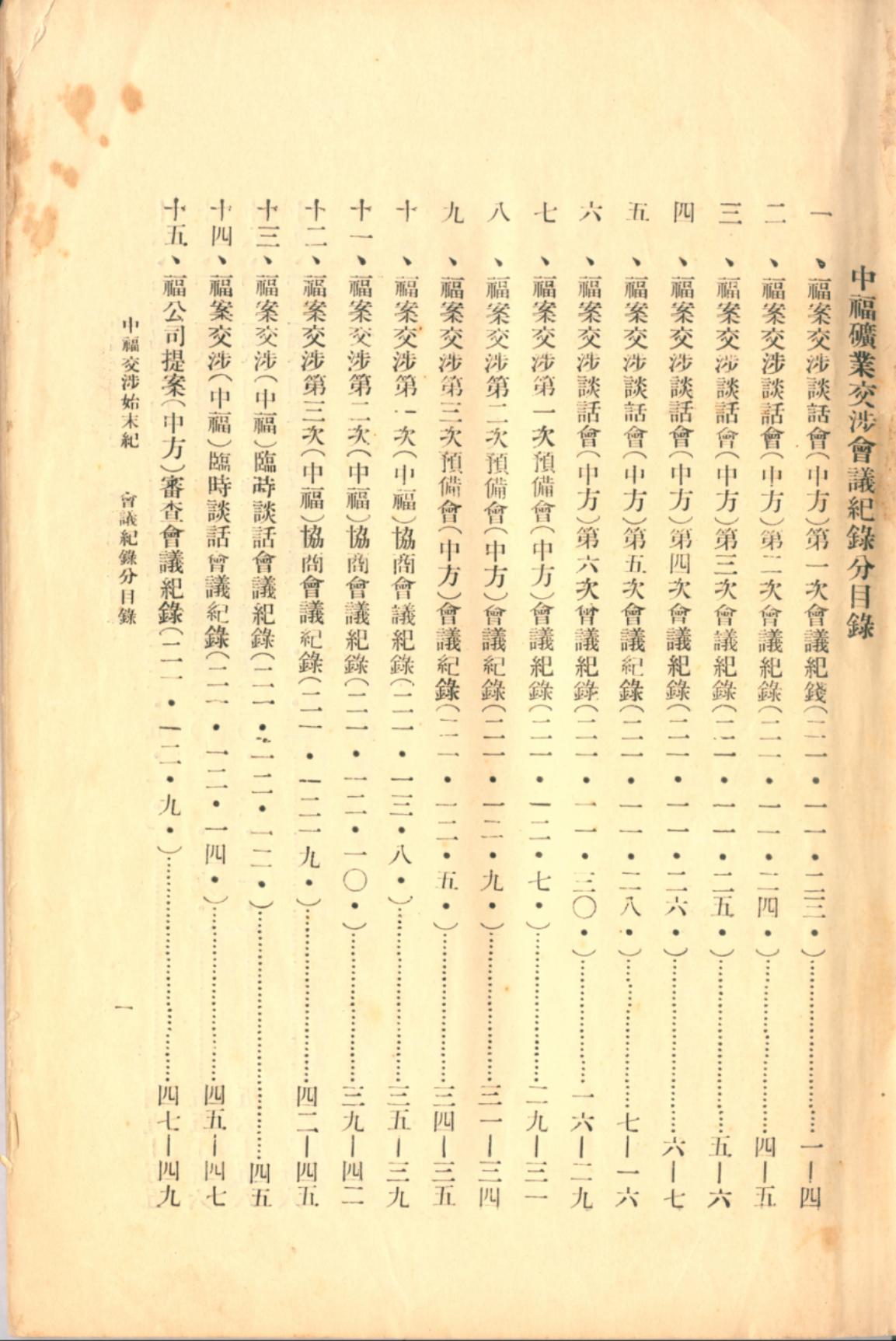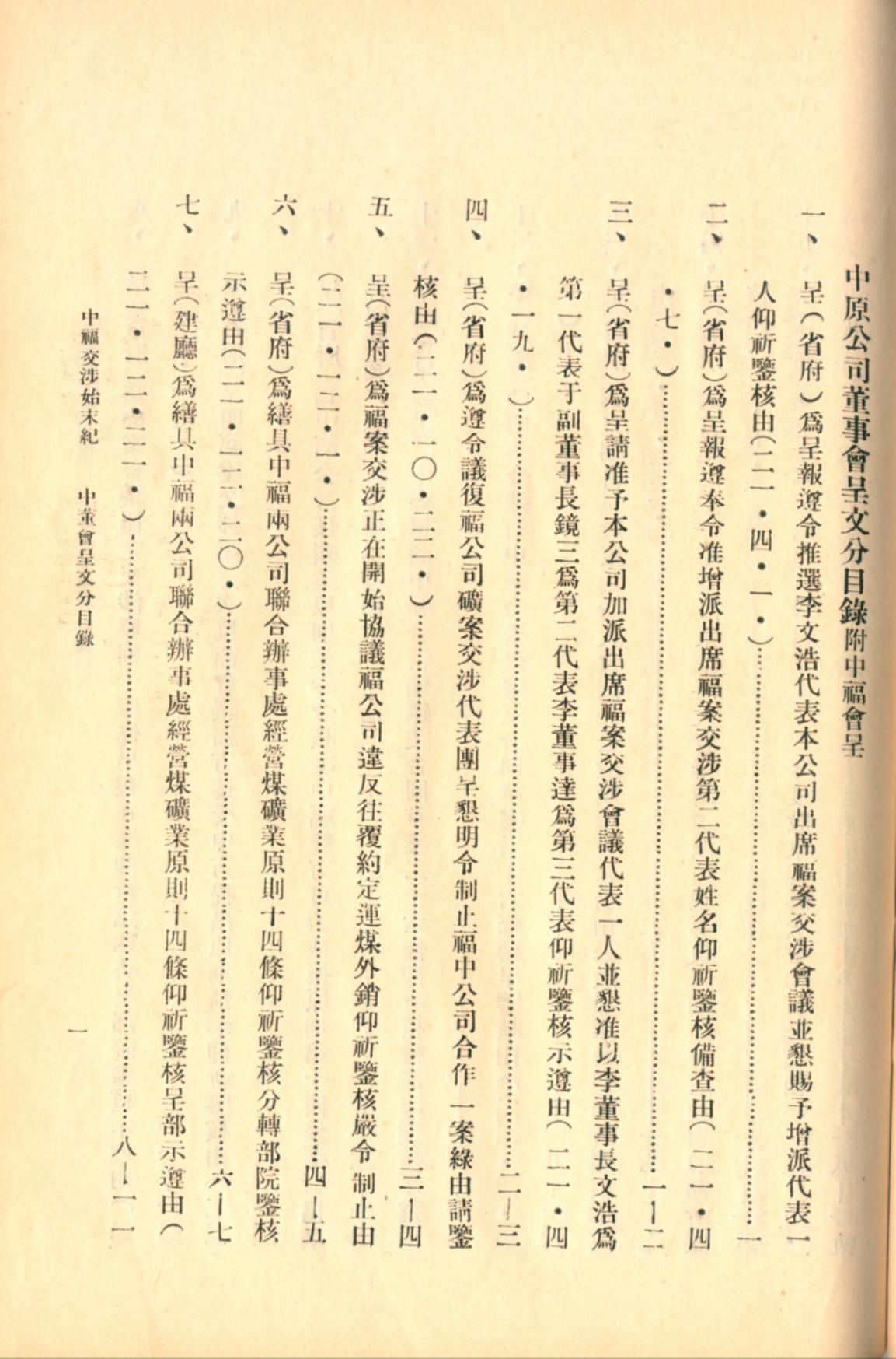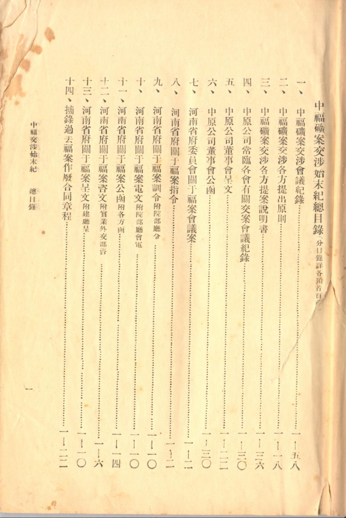 《中福矿案交涉始末纪》记述了当时中原公司与英国福公司合作进行之原委,并附录了中福矿案交涉会议记录、矿案交涉双方提出的合作原则、矿案交涉各方提出的提案说明书、中原公司常临各会有关文案会议纪录、中原公司董事会呈文、公函,河南省府委员会、河南省府实业部、建设厅、行政院等各方面关于福案的重要文电以及双方合作前的各项合同、章程等十四类文件。