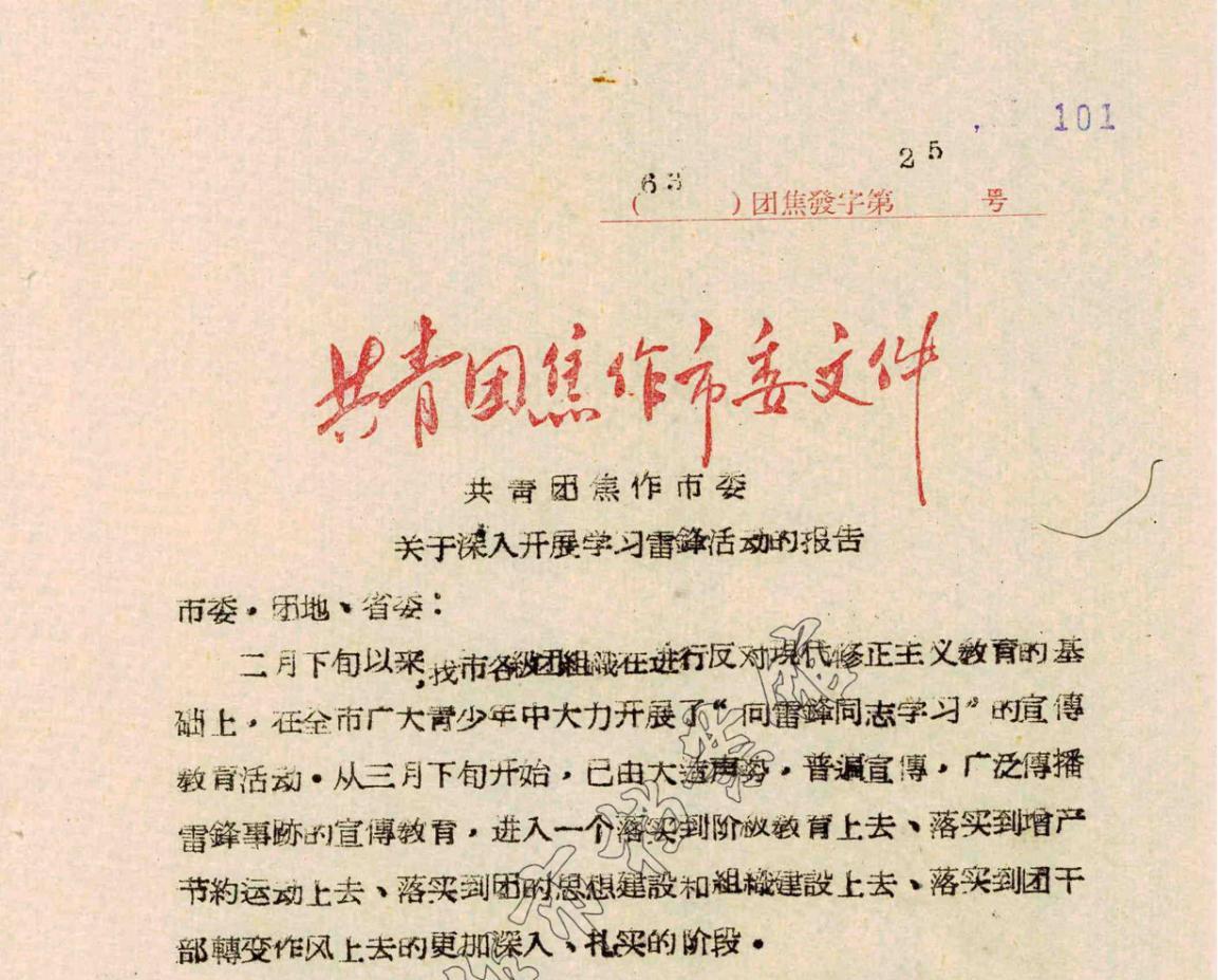 1963年4月18日,共青团焦作市委《关于深入开展学习雷锋活动的报告》首页(焦作市档案馆藏)