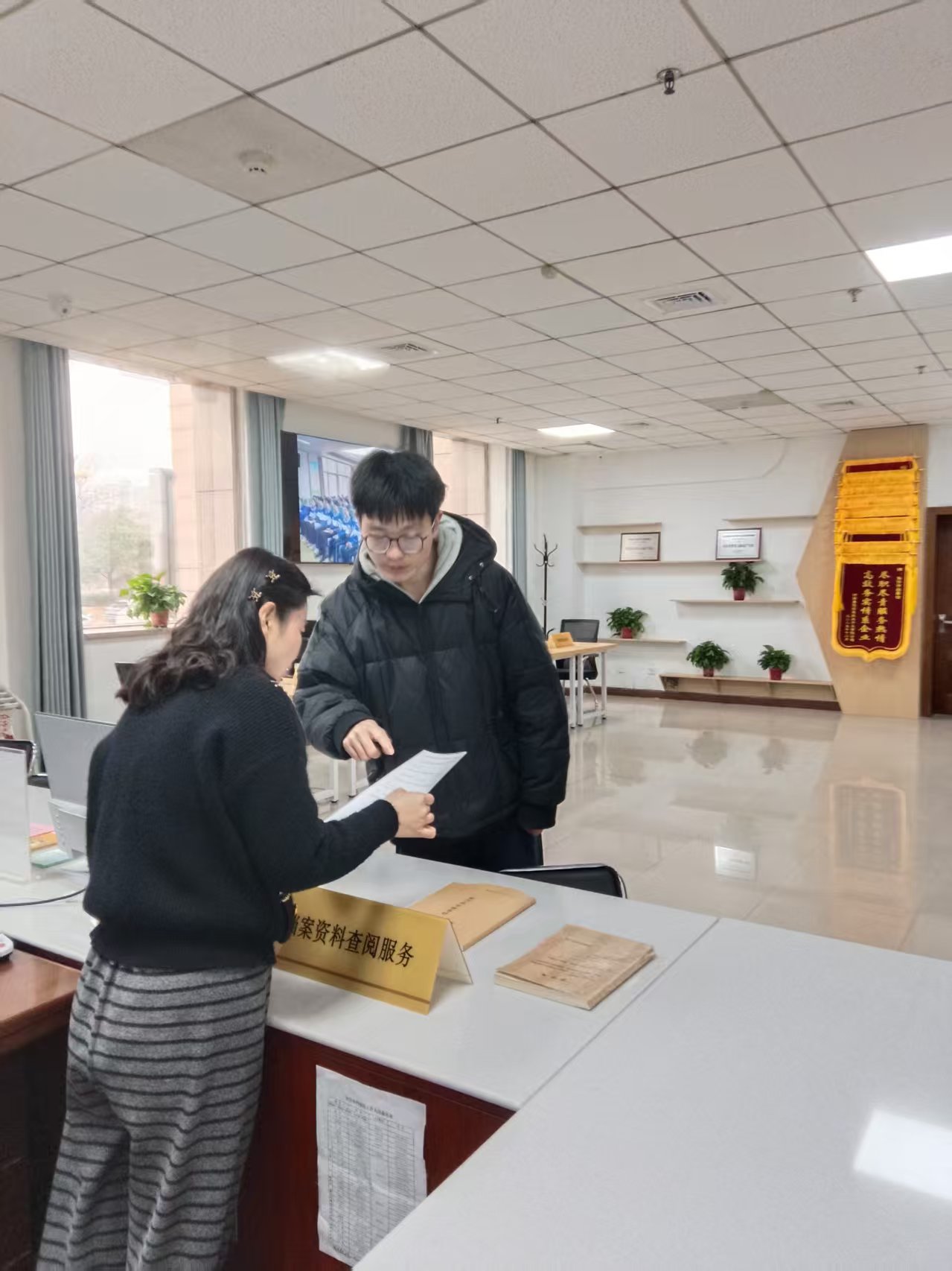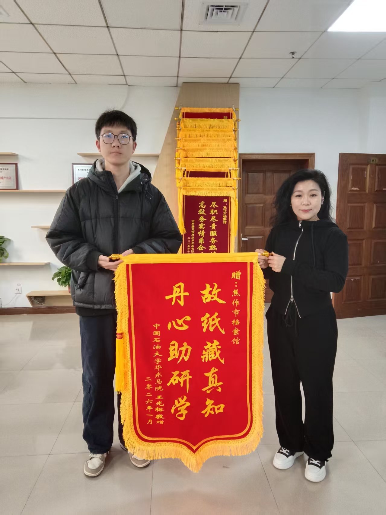 近日,中国石油大学马克思主义学院王某专程来到市档案馆,将一面印有“故纸藏真知,丹心助研学”的锦旗送到保管利用科工作人员手中,对其在寒假期间提供的优质档案查阅服务表示衷心感谢。